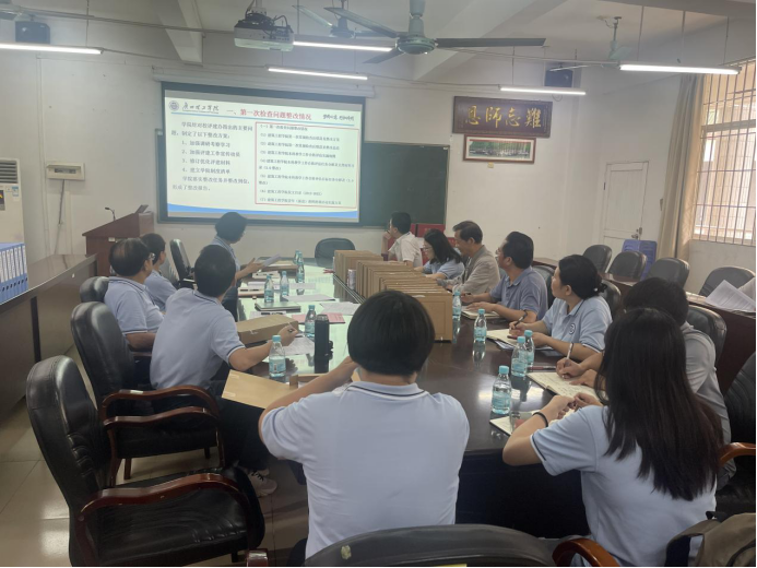 吴炎海院长就本科教学工作合格评估第二次常规检查工作进行汇报。汇报的内容分为第一次检查问题整改情况、规章制度制修订情况、实验室管理与建设情况、实验教学和实习实训开展情况、实践教学基地建设情况、青年教师磨课工作情况、教研室教研活动开展情况、观测点支撑材料收集情况共计八项内容进行逐一汇报,并对目前建筑工程学院本科教学工作合格评估存在的问题以及下一步工作计划做出汇报。
